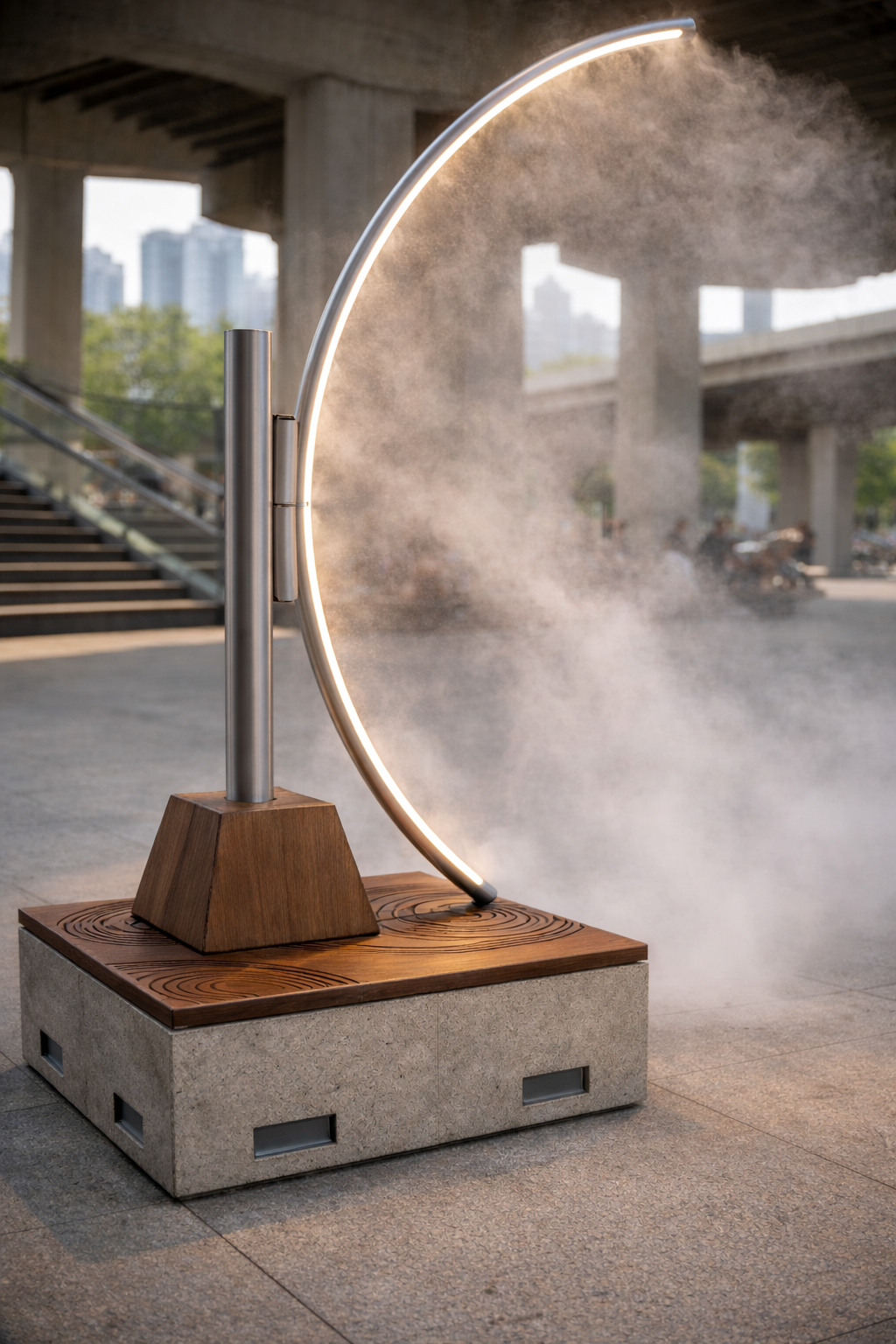 ALO LUMA est une installation de brumisation haute pression conçue comme un objet architectural.
